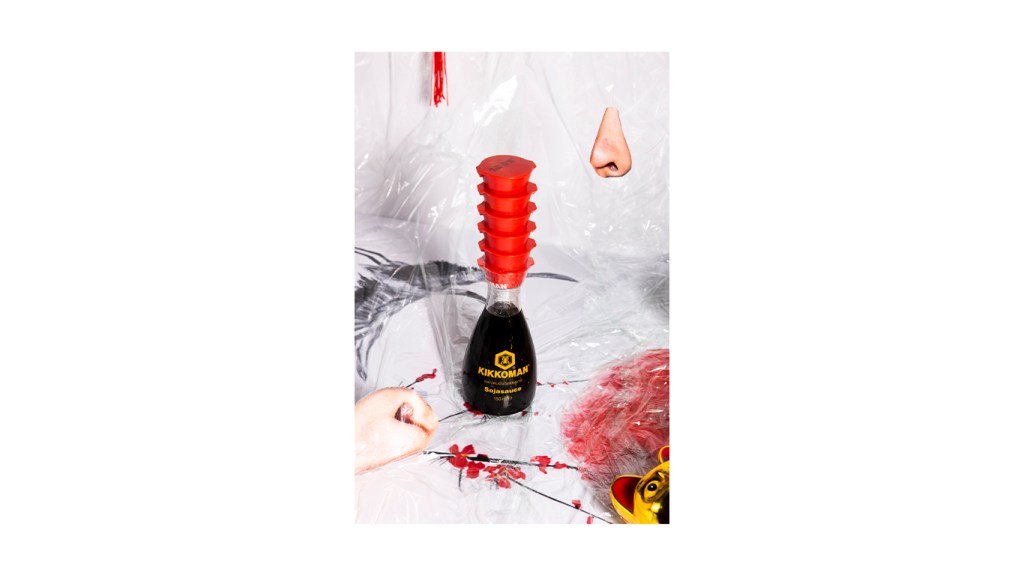 I think it has been becoming more interesting for me to use the cut-outs of my body parts and combine them with the food or object, for example, the soya sauce bottle here.