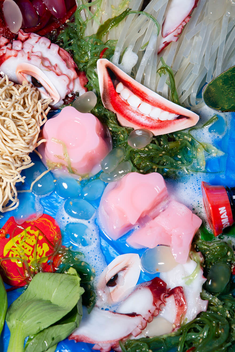 It all started with a menu from a small Asian bistro in Berlin. HIEN HOANG (*1990, Quang Ninh/Vietnam) was amazed by the variety of dishes that came from Thailand, China and Vietnam. This was the trigger to think about clichés of Germans towards Asian cultures and to do artistic research on them. Hoang experiments with arrangement, staging and installation – adding layers of meaning by recontextualizing everyday objects and habits. Engaging with foreign views of Asia also changes perceptions of her own identity. Since 2018, Hoang has been working on her work “Asia Bistro”, which combines photographic works, performance, and video, and can be placed in different installation contexts depending on the location. Foods labeled as typically Asian are often part of her work. Whether it’s noodles, raw salmon, tofu or coconut milk – because nothing is as linked to identity and home as certain local dishes and ingredients. Plump, glossy and succulent – simply sensual – they are often staged in combination with velvety or iridescent fabrics, patterned vases and other excitingly textured props. At the center, however, is the body. It is covered with soaked rice paper, it walks on cooked noodles – as in her multimedia performance project Made in Reis, 2021, with which she wants to get to the bottom of the causes of resentment towards Asians visually and performatively.