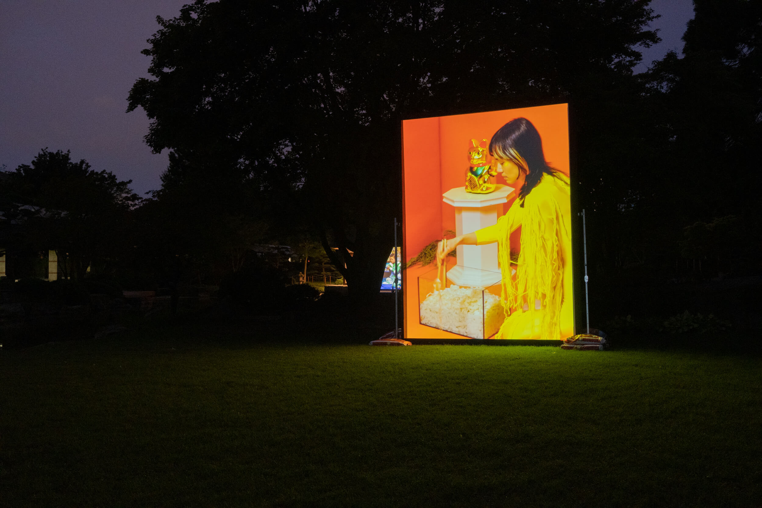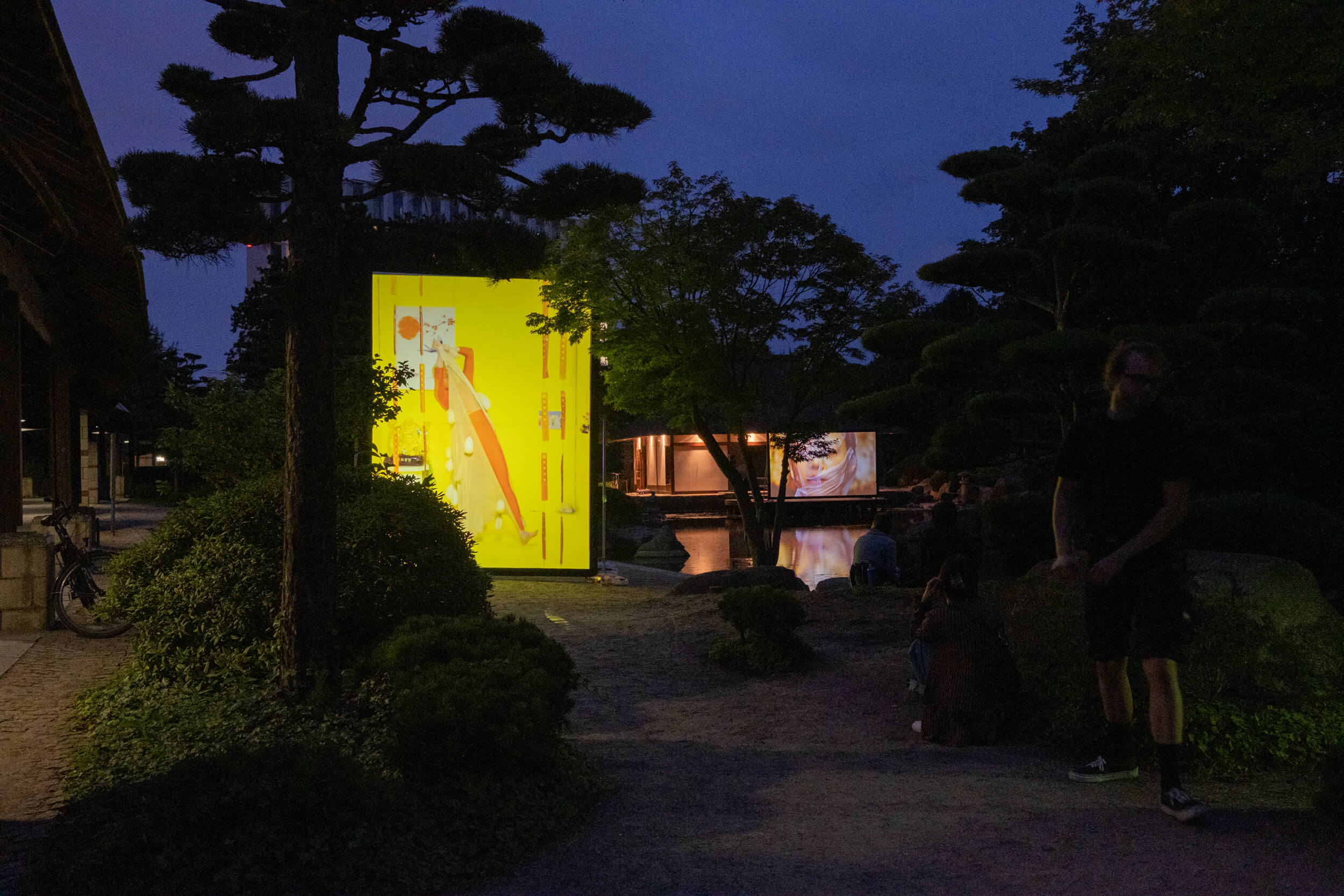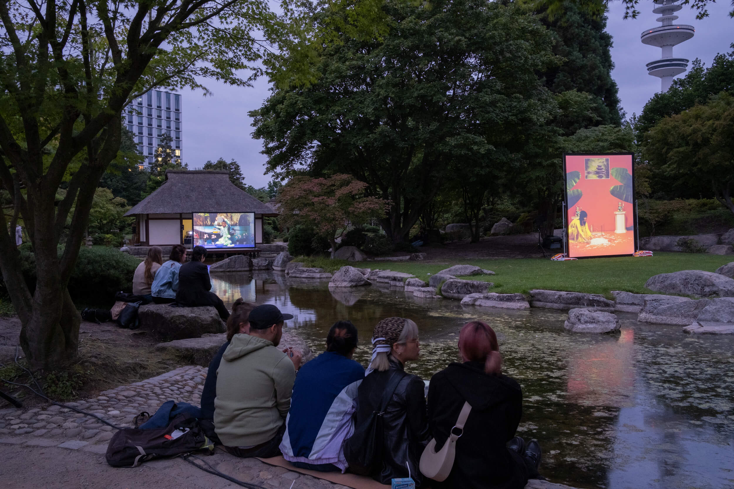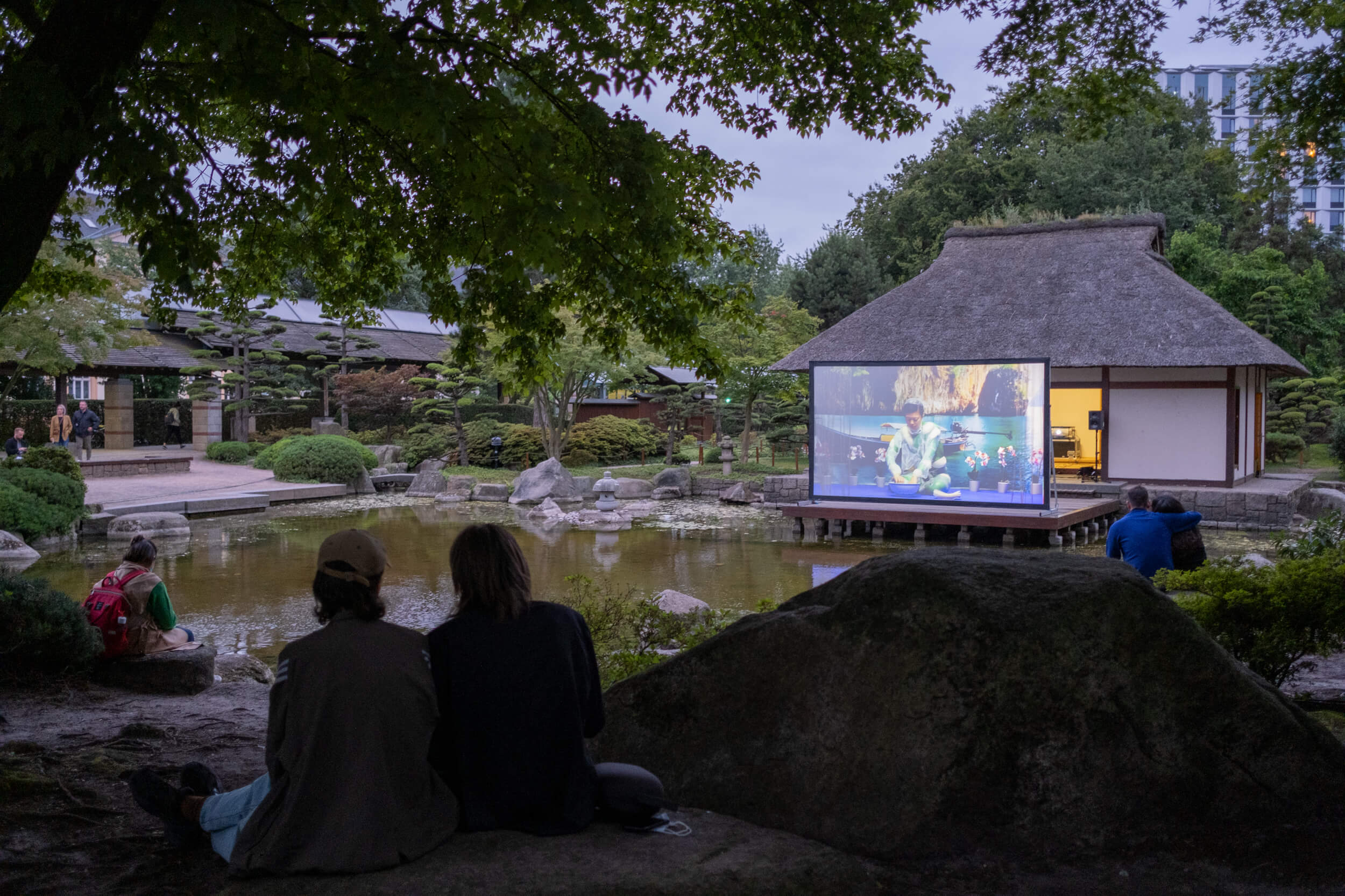 For the premiere of “Made in Rice” Hien Hoang transformed the Japanese Tea House and Garden in Planten un Blomen Park, Hamburg, into a stage for a powerful multimedia installation. The work featured three large video screens and an eight-channel sound system, creating an immersive soundscape that enveloped the garden and lake. This setup not only showcased the 3-channel performance video but also integrated the tranquil garden environment into the artwork. The installation fostered a dialog between the peaceful setting and the complex themes of cultural identity, stereotypes, and discrimination, inviting viewers to reflect on these issues in a space of contemplation and beauty.